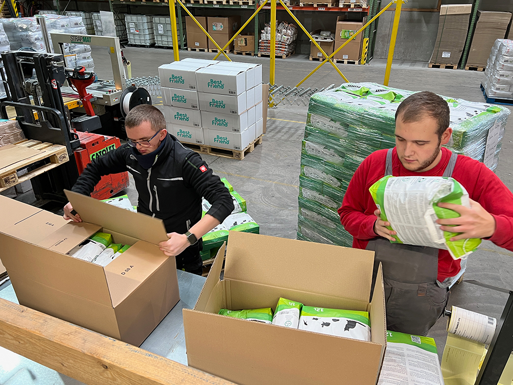 Zu ihren Aufgaben gehört es, die abgefüllten Katzenstreu-Beutel mit Hilfe einer Maschine in Versand-Kartons zu verpacken und nach Vorgabe zu etikettieren.